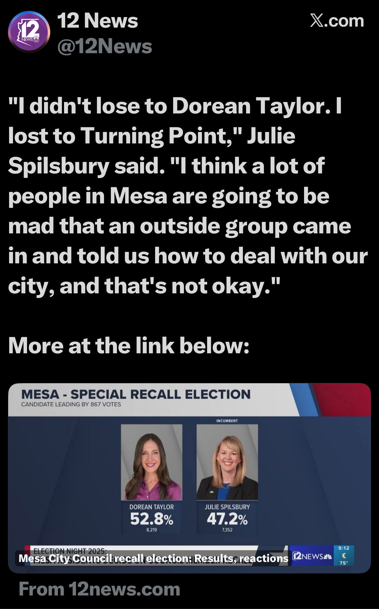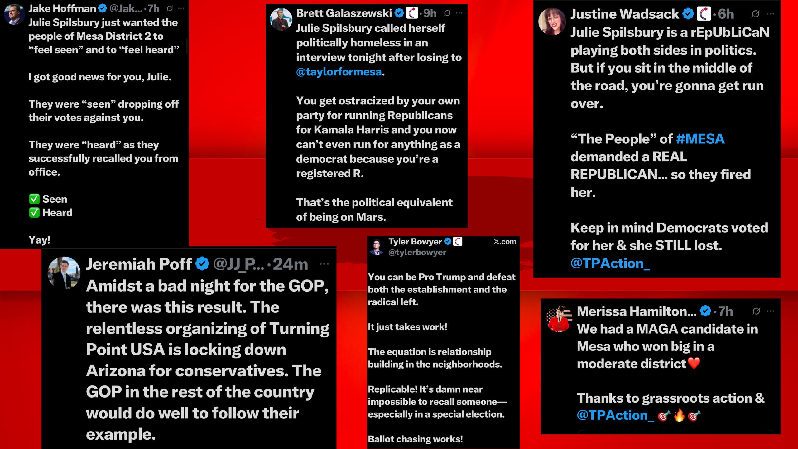 Political observers view the result as an early sign of Turning Point’s rising dominance in Arizona politics ahead of 2026. Reporter Jeremy Duda noted on X that Spilsbury had previously won reelection with 66% of the vote — making this reversal remarkable. Insiders say the successful recall shows how the MAGA movement has only intensified in the wake of Turning Point founder Charlie Kirk’s death.
