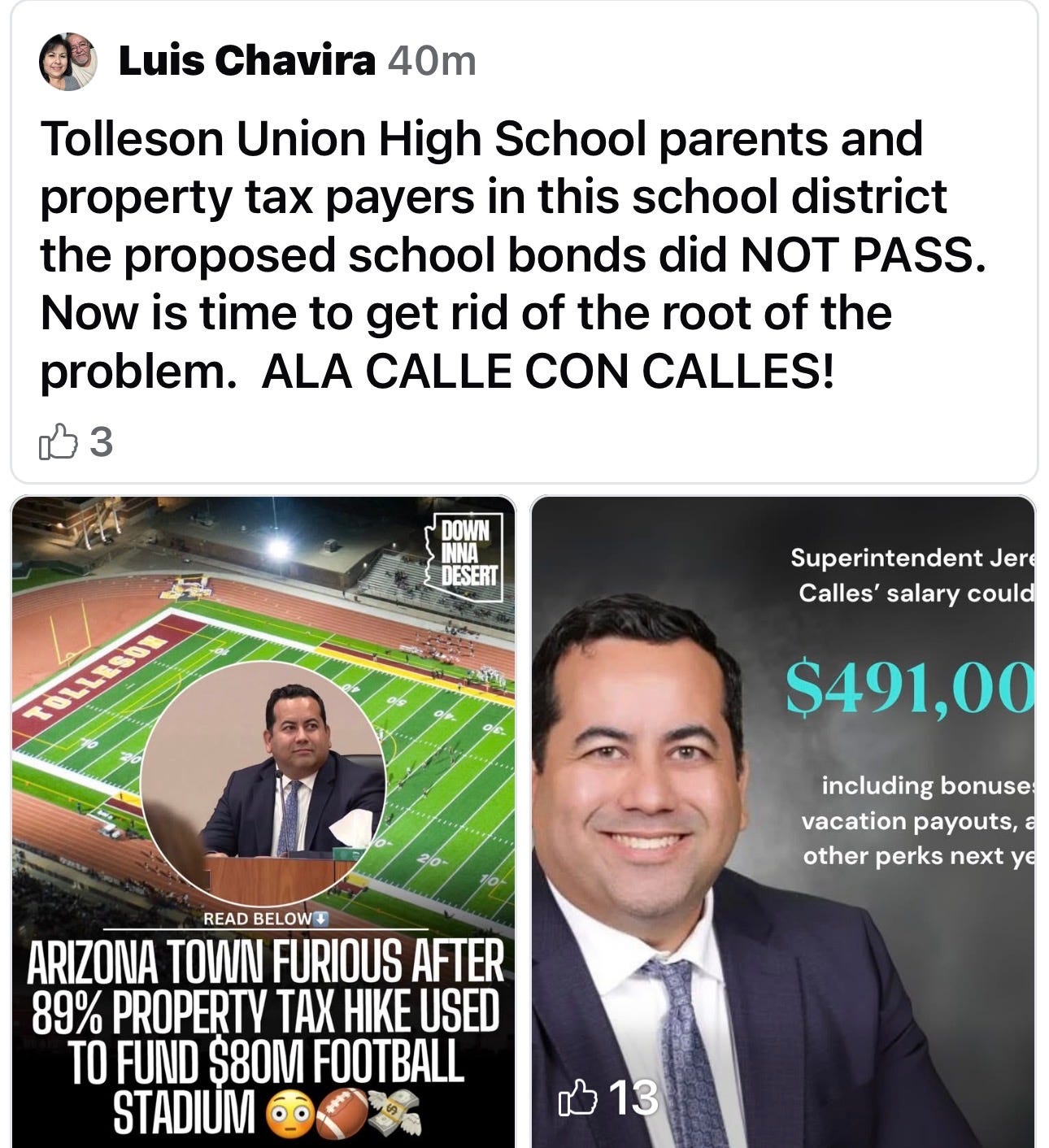 Tolleson residents voted against continuing the Tolleson Union High School District’s budget override in Tuesday night’s election, signaling frustration over district spending and priorities.