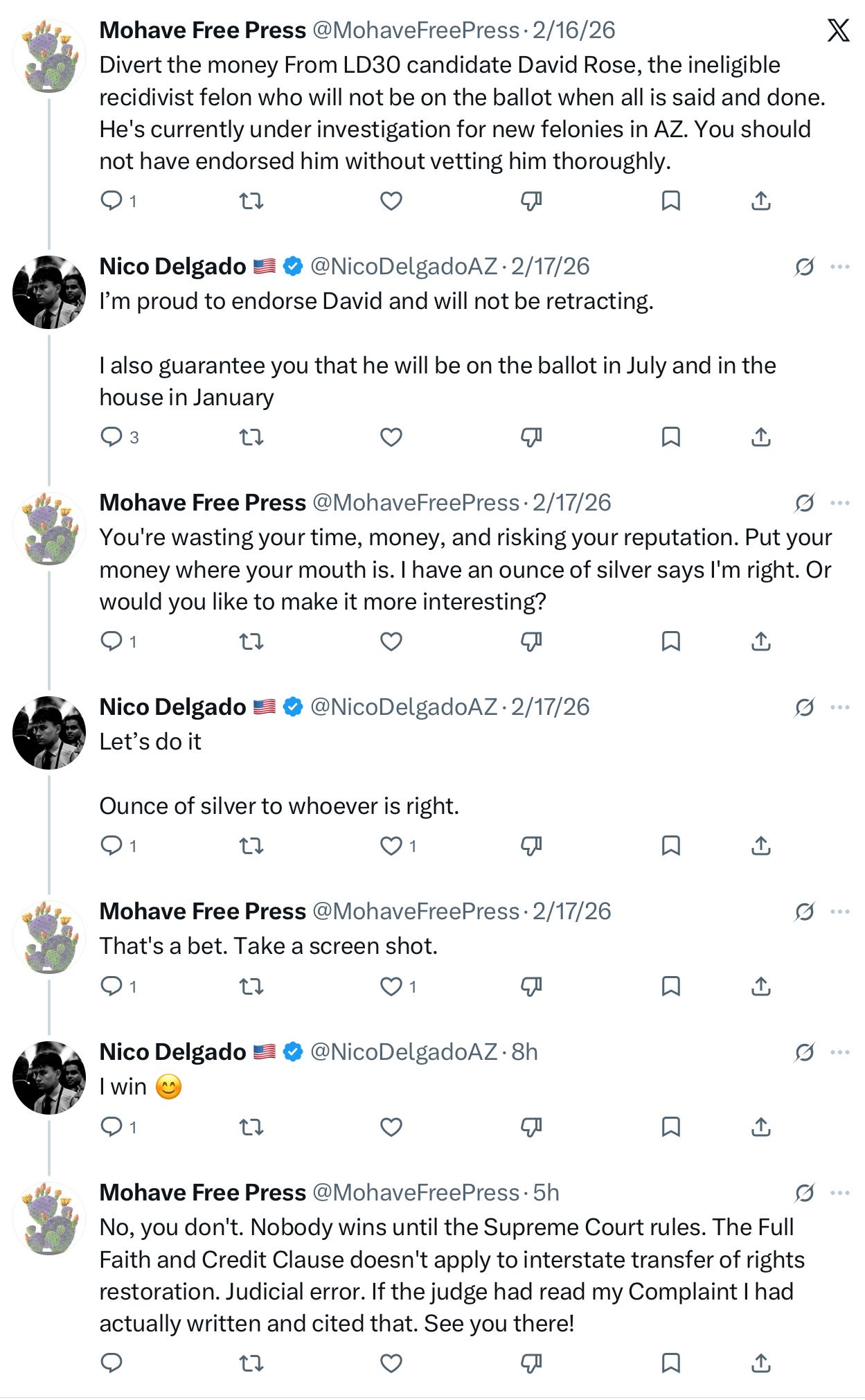 Before we dive into the court hearing, State 48 News bumped into this quirky conversation on X. Esposito engaged in a public exchange with Niko Delgado, who is assisting Rose’s campaign, that escalated into a wager. This unusual move reflects the often unconventional nature of Arizona politics. But it puts her “nobody wins” statement into context.