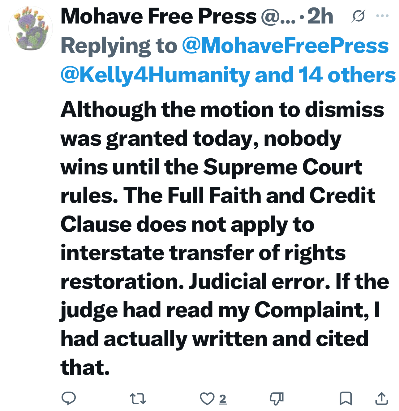 In less than 15 minutes, the judge granted the Motion to Dismiss from the bench, finding that Rose’s Kentucky restoration of civil rights is entitled to Full Faith and Credit under the U.S. Constitution and that he is a qualified elector.