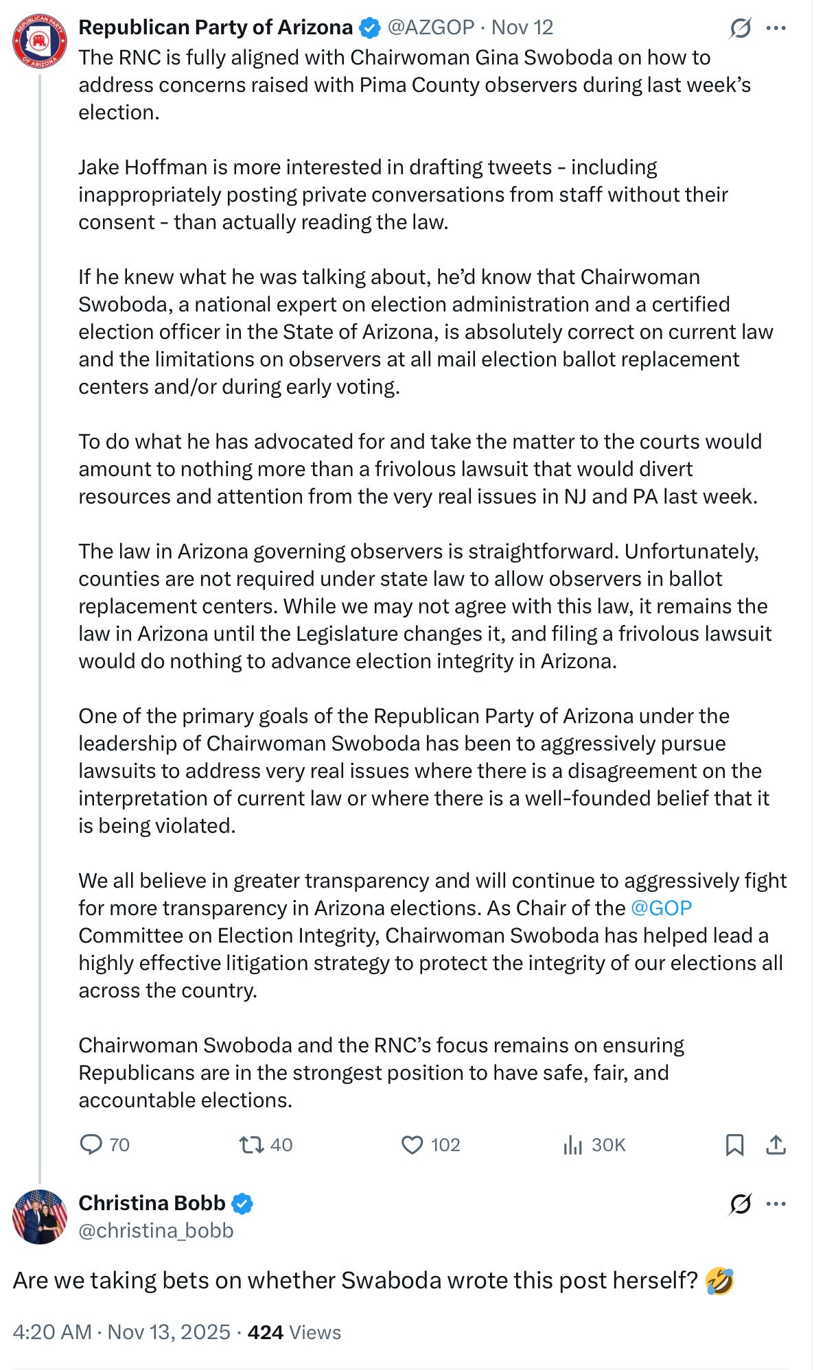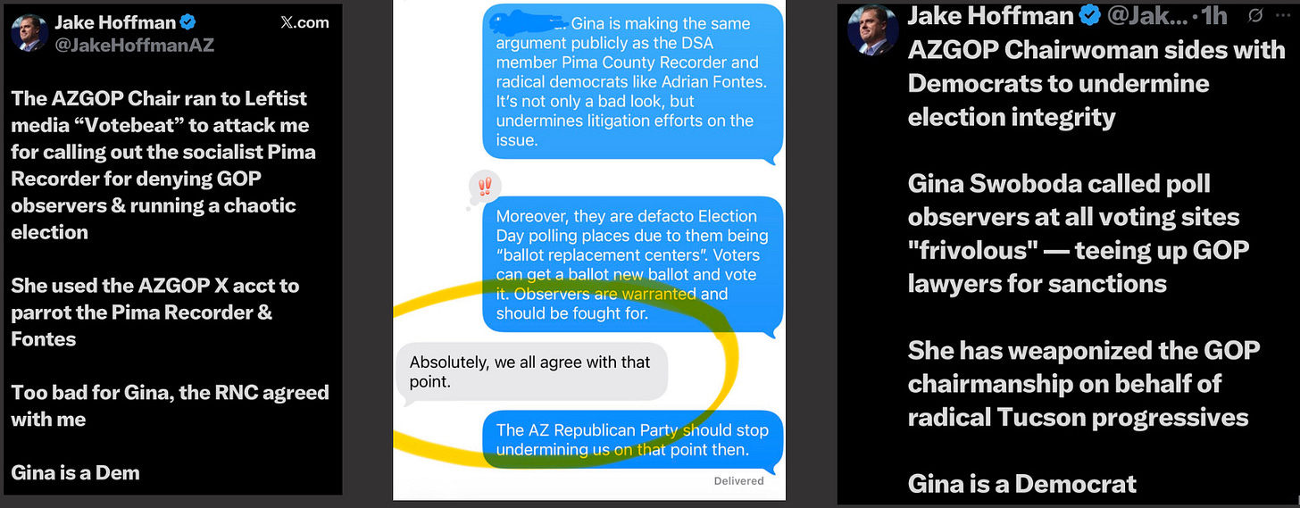 A sharp divide opened inside the Arizona Republican Party this week as the AZGOP’s X page, controlled by Gina Swoboda, publicly rejected Queen Creek Republican Sen. Jake Hoffman’s claims that Pima County violated state law when political-party observers were denied access to ballot replacement centers during last week’s election.