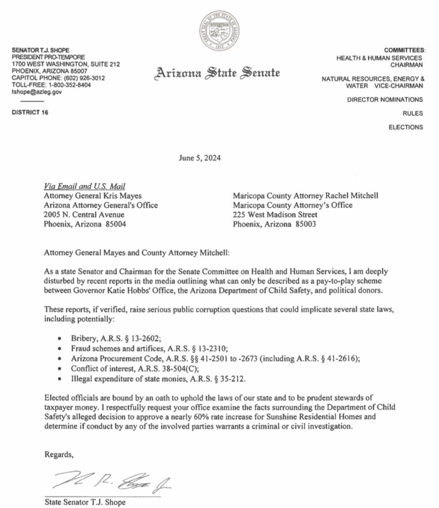 Yesterday, Senator T.J. Shope sent you a letter outlining five potential violations of state law, including bribery, fraud, improper procurement, conflicts of interest, and illegal expenditure of state monies.