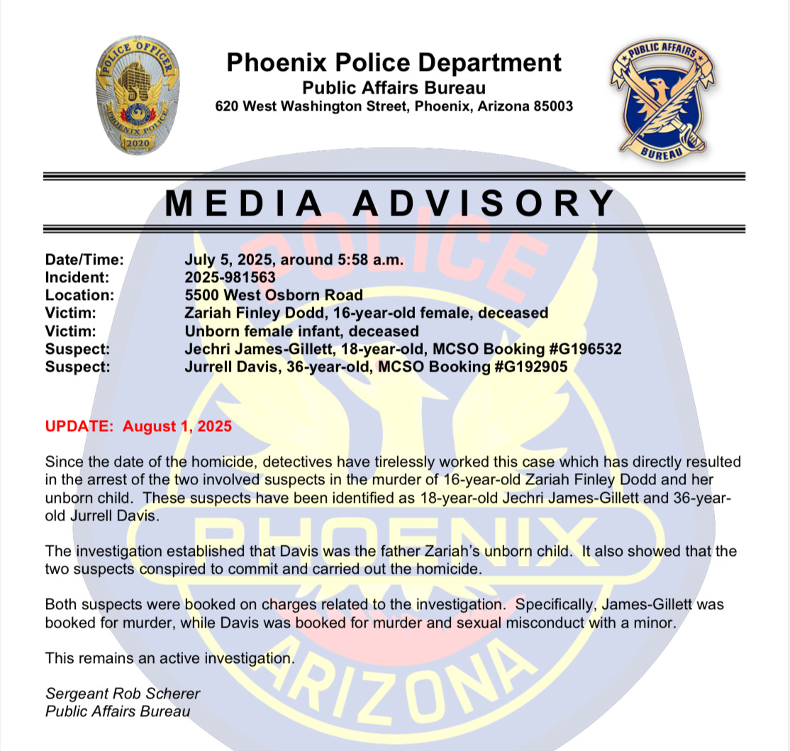 In a public update, Phoenix police said detectives “tirelessly worked this case which has directly resulted in the arrest of the two involved suspects in the murder of 16-year-old Zariah Finley Dodd and her unborn child,” according to a police media advisory.