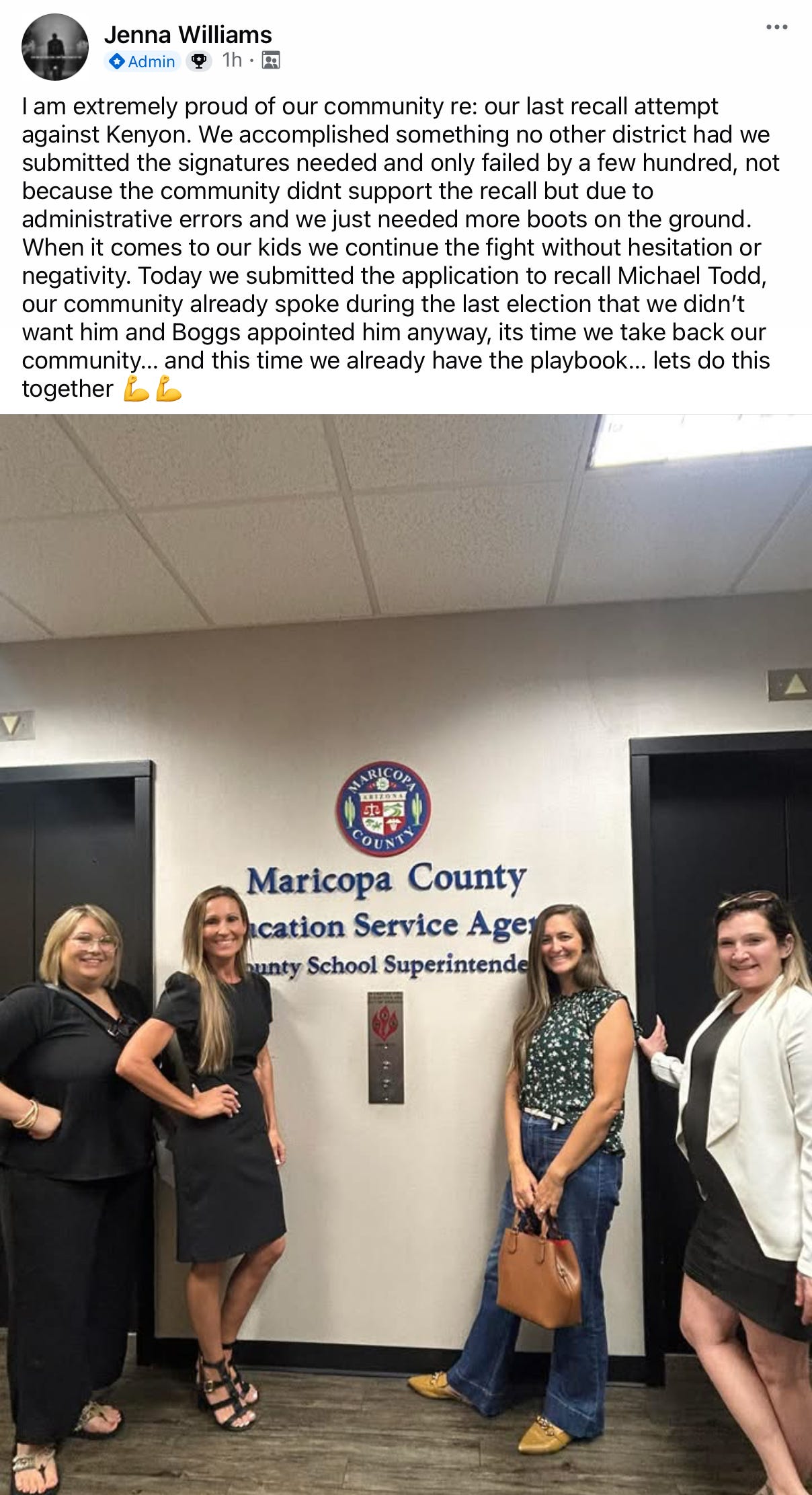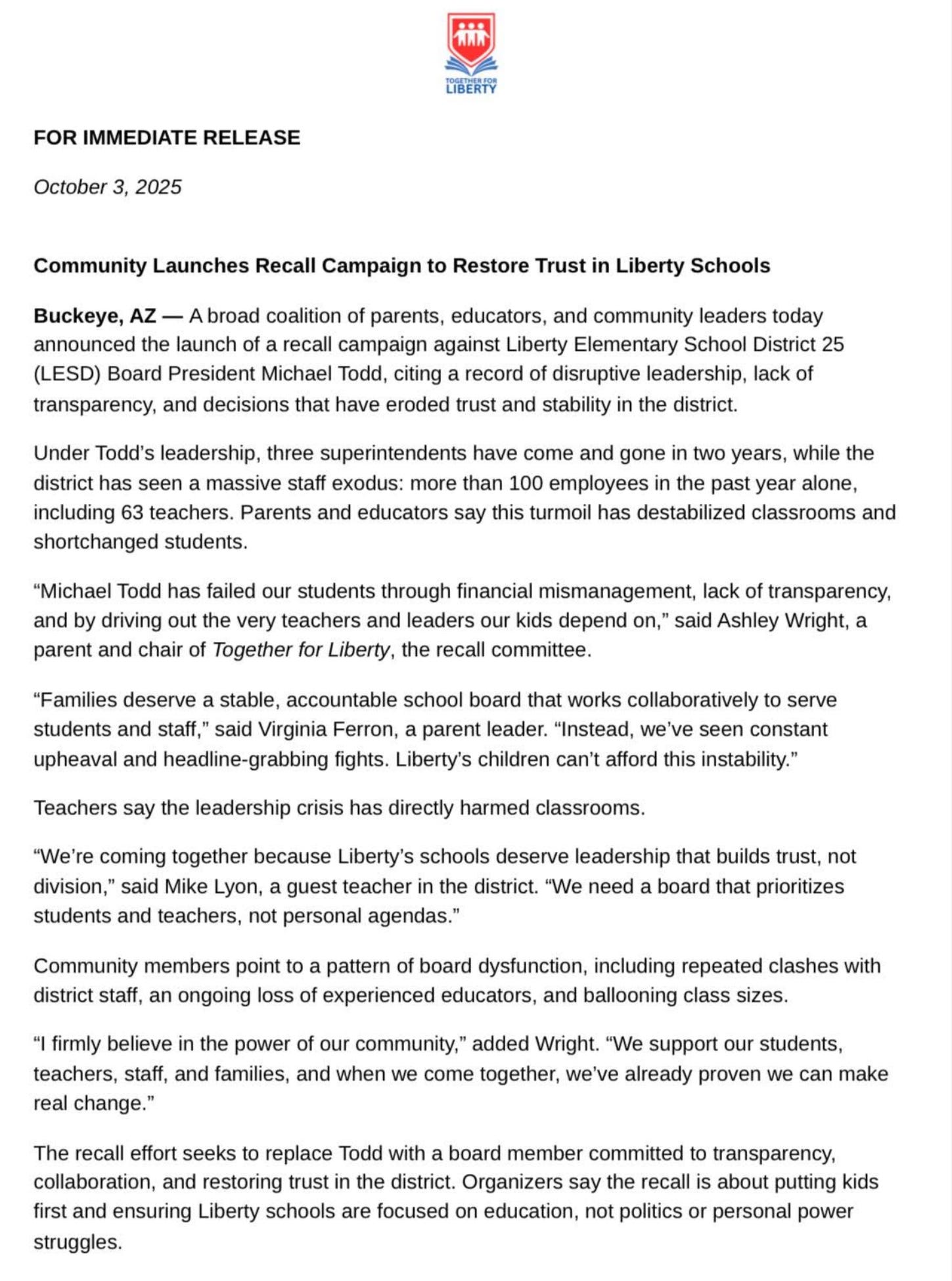 A fresh showdown is underway in the Liberty Elementary School District, where a parent coalition “4 Liberty Kids” has launched a new recall effort against Governing Board President Michael Todd. What began as a local dispute over school governance has now widened into a political fight, drawing in Republican legislative district leaders who are vowing to stand firmly behind Todd and casting the controversy as a spiritual battle over the very soul of public education.
