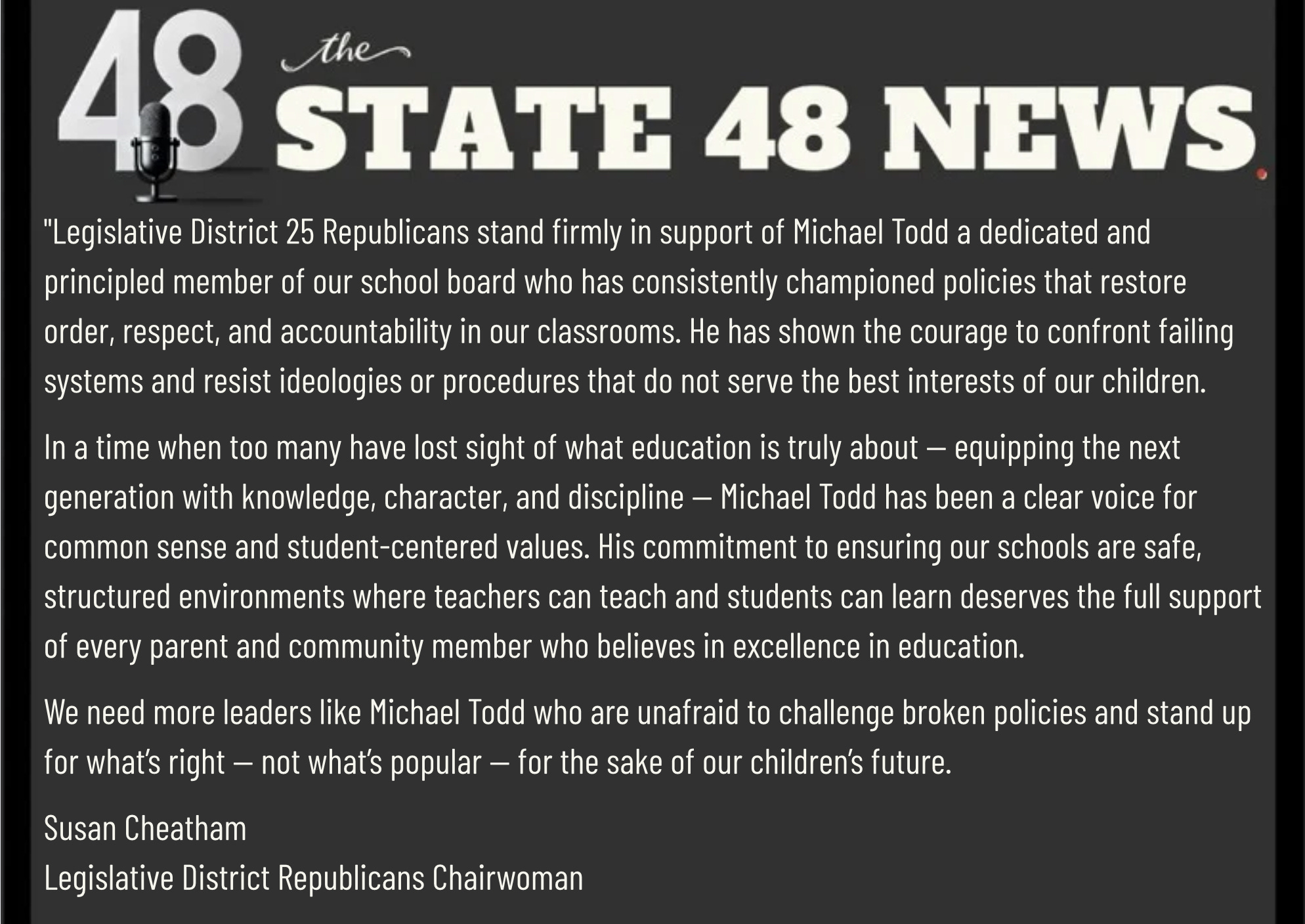 GOP Leaders in LD23 and LD25 fully support Michael Todd and are confident they will defeat the parent group again, even as “4 Liberty Kids” remain mobilized and determined.