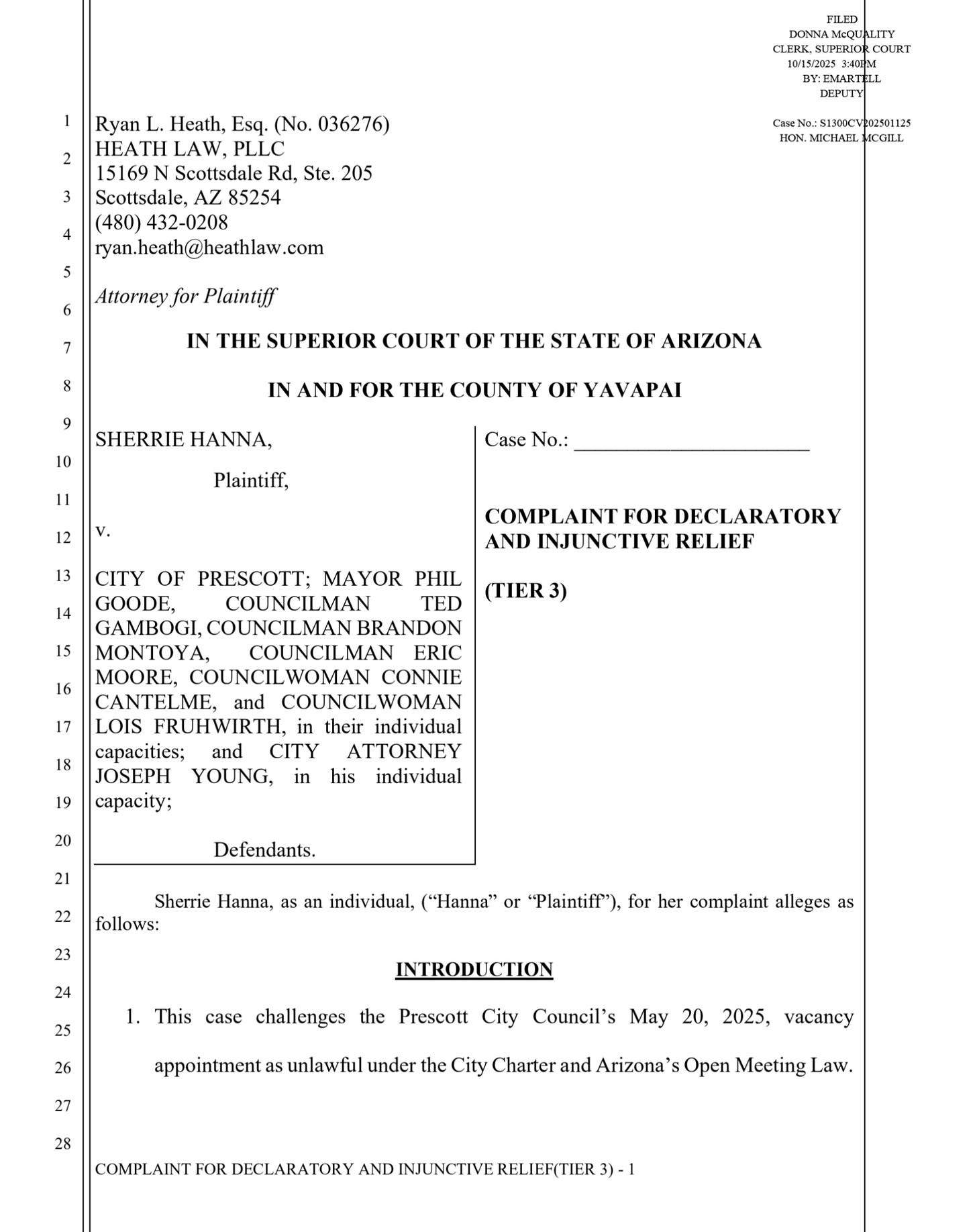 On September 17, 2025, Heath filed a notice of claim against the City of Prescott, followed by a full lawsuit and TRO request in Yavapai County Superior Court. The complaint outlines three primary issues: