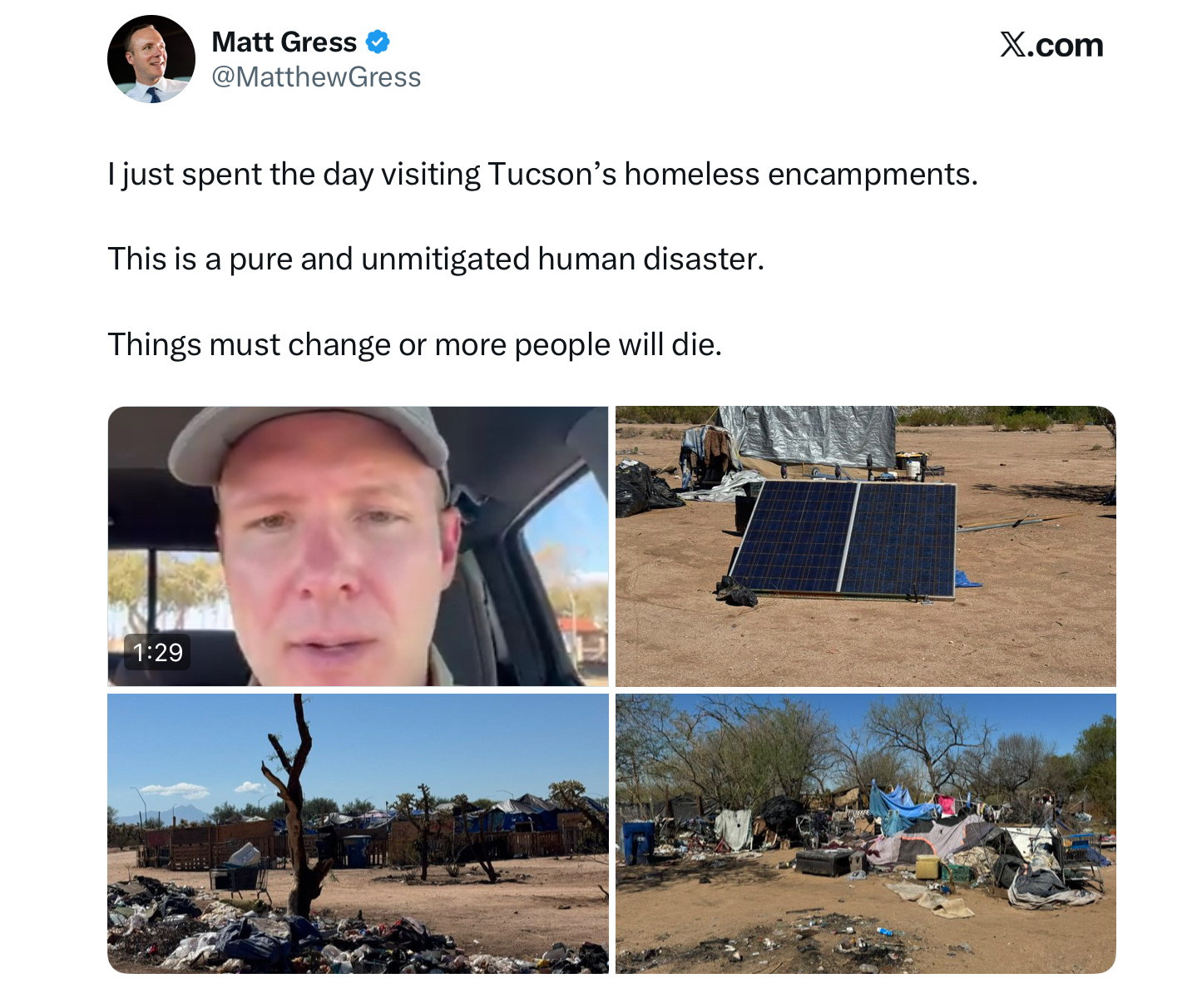 Gress, visually touring encampments and documenting conditions, has used social media to call the situation urgent. One post read: “I just spent the day visiting Tucson’s homeless encampments. This is a pure and unmitigated human disaster. Things must change…”