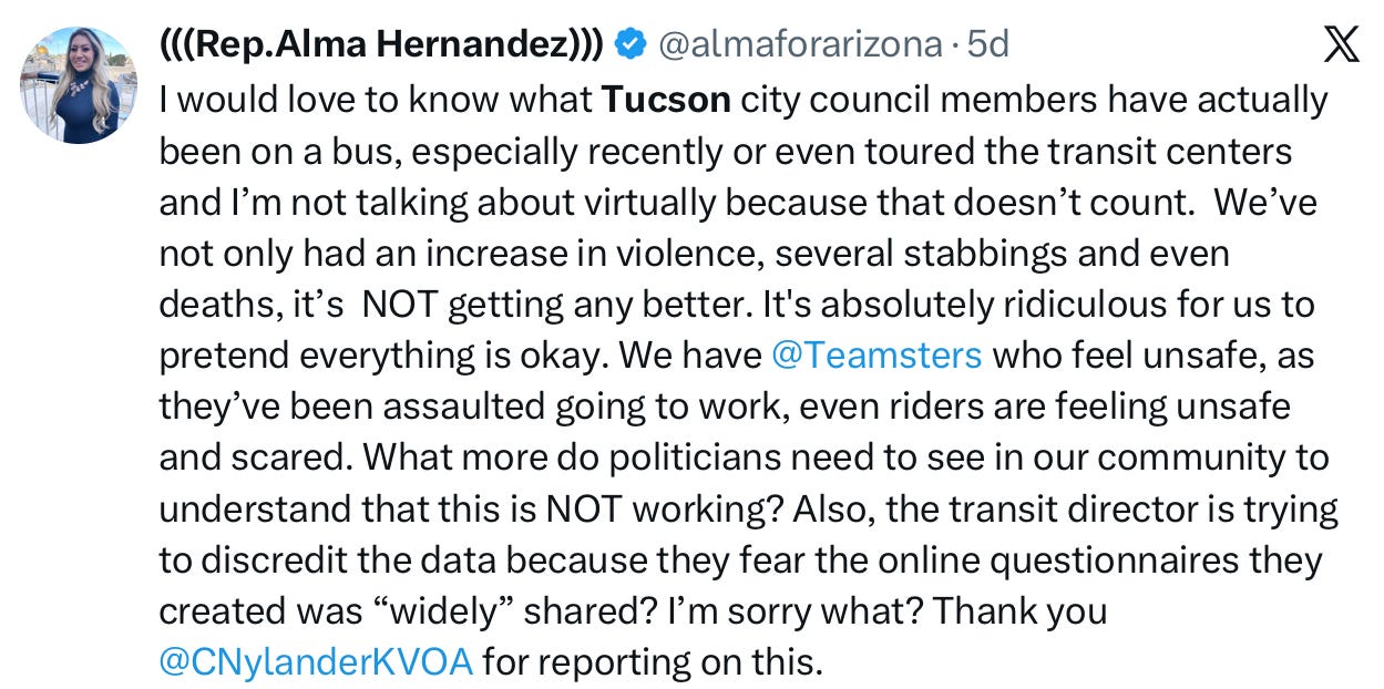 Democrat Representative Alma Hernandez has also spoken out against the transit crisis after a fight on the bus escalated to shots being fired last week.