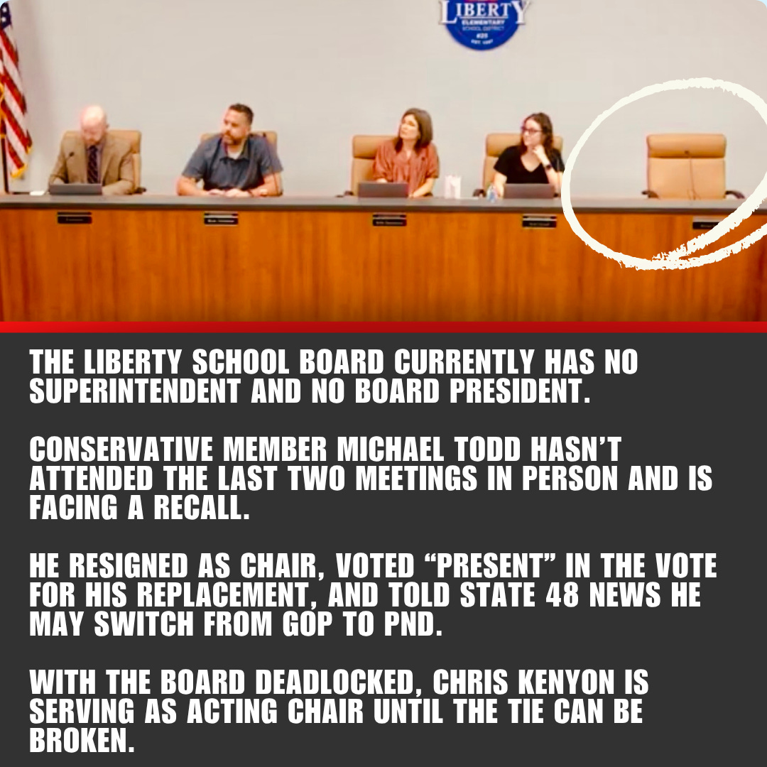Last week, our coverage of the Liberty School Board story was limited to a simple graphic, rather than a full article. After the meeting, former Board Chair Michael Todd informed us that he had participated via Zoom because he “was traveling for work.” We have not independently verified this claim. Meanwhile, the Board remained deadlocked on who would serve as president, so Kris Kenyon who is vice chair, stepped in as acting president in the interim.