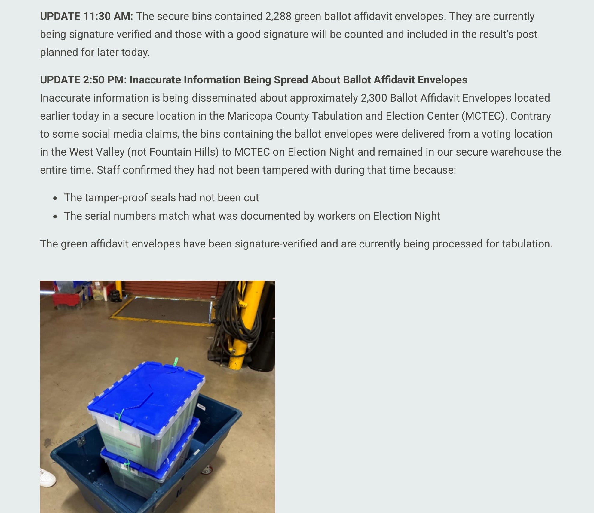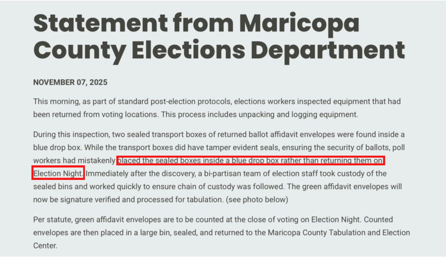 The Maricopa County Elections Department issued its first public statement Friday, confirming, “poll workers had mistakenly placed the sealed boxes inside a blue drop box rather than returning them on Election Night.”