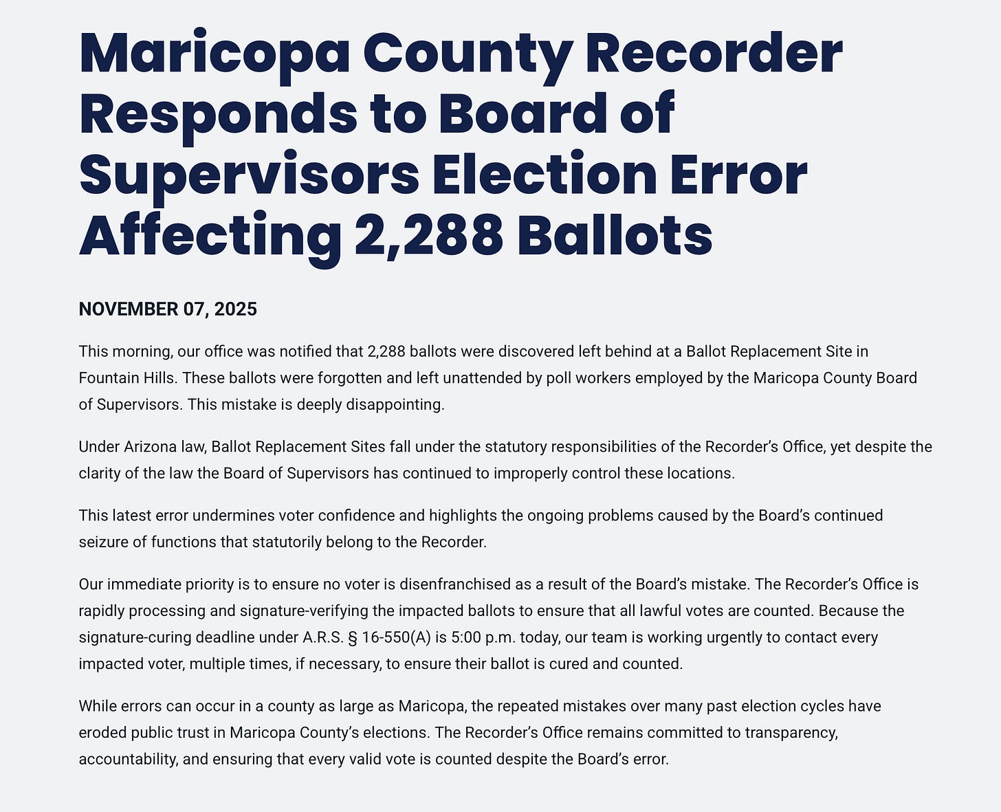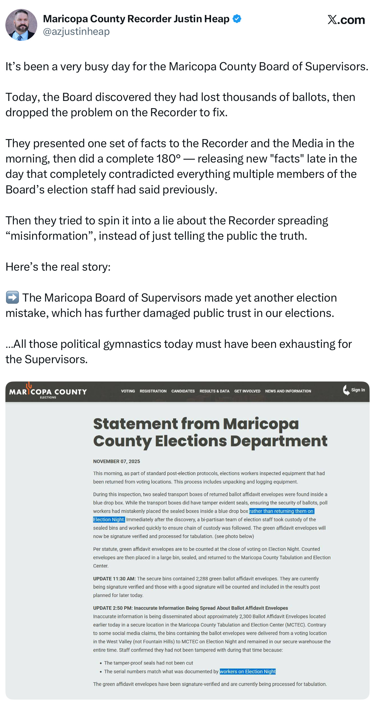 Recorder Heap and the Maricopa County Board of Supervisors that controls the Elections Department have been engaged in both courtroom battles and a heated social media back-and-forth. Late into the night, Recorder Heap made the following post: