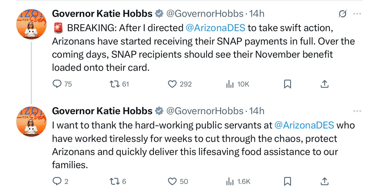 Hours before the Supreme Court issued its stay siding with Trump, Hobbs told Arizona families that SNAP benefits would be loaded this weekend — Maricopa’s ballot fiasco — Liberty School Board chaos