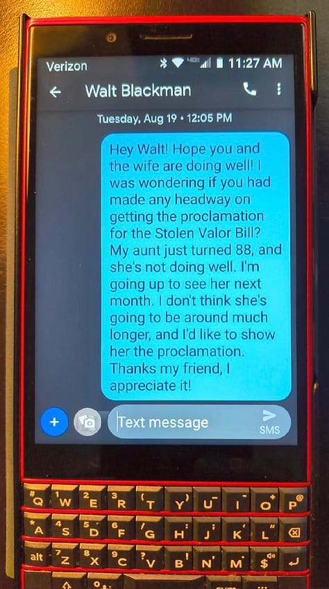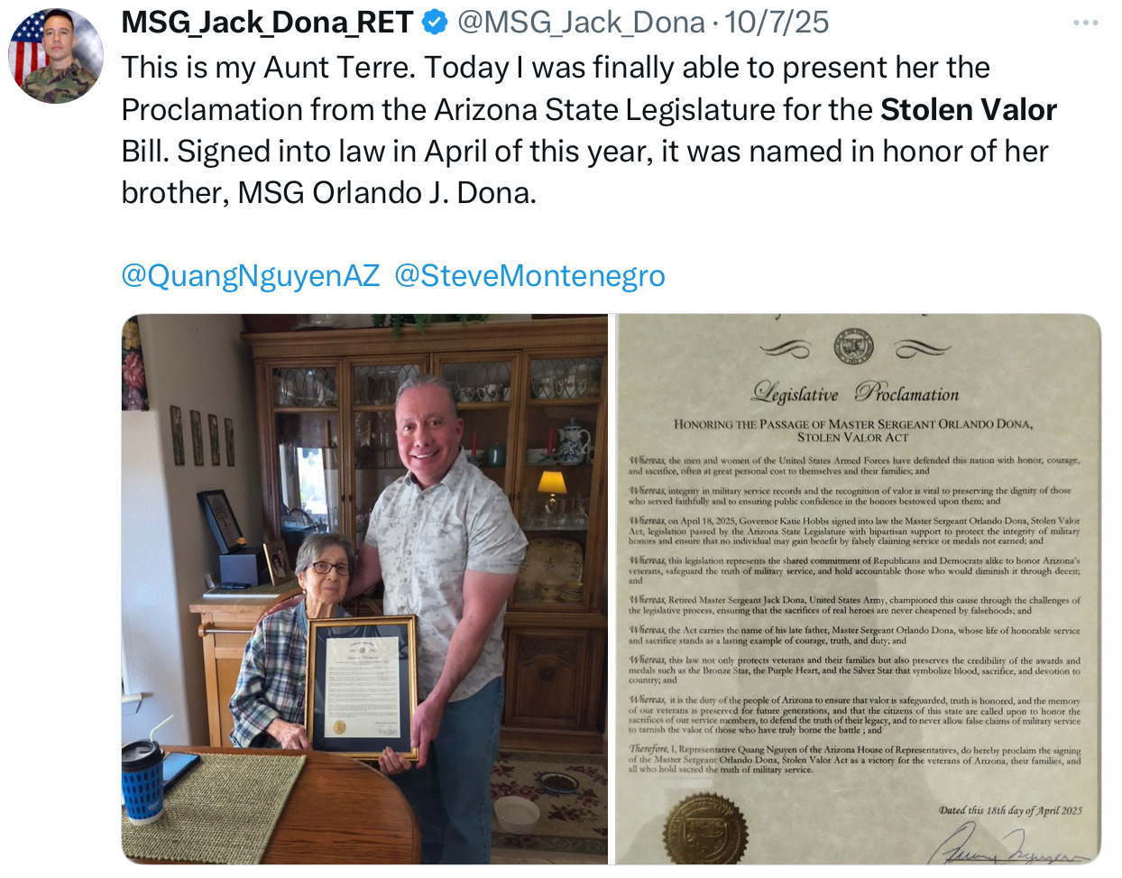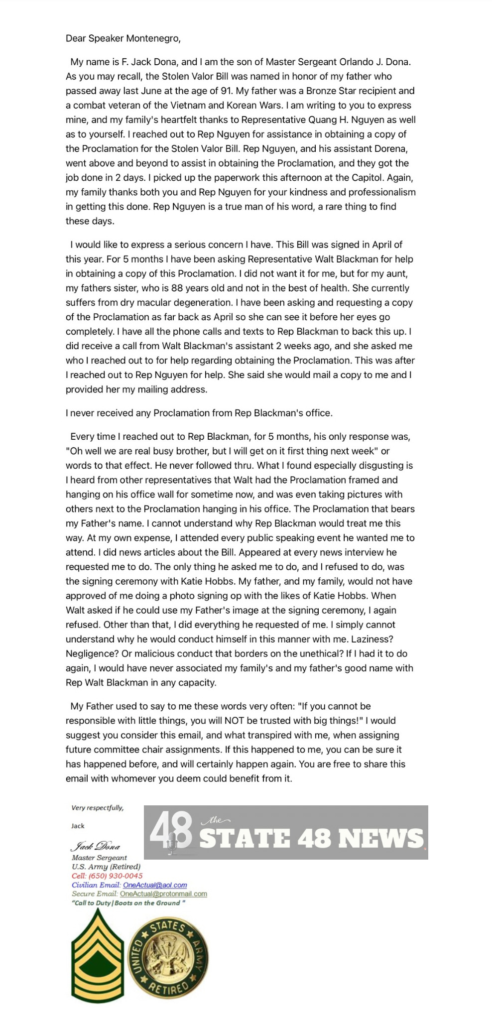 Retired U.S. Army Master Sgt. Jack Dona, whose late father is the namesake of Arizona’s newly enacted Stolen Valor measure, says the bill’s sponsor, Rep. Walt Blackman, failed to provide him a copy of the ceremonial proclamation despite months of requests. Dona says he needed the document for his 88-year-old aunt, whose eyesight is failing and who was eager to read the state’s formal recognition of her brother.