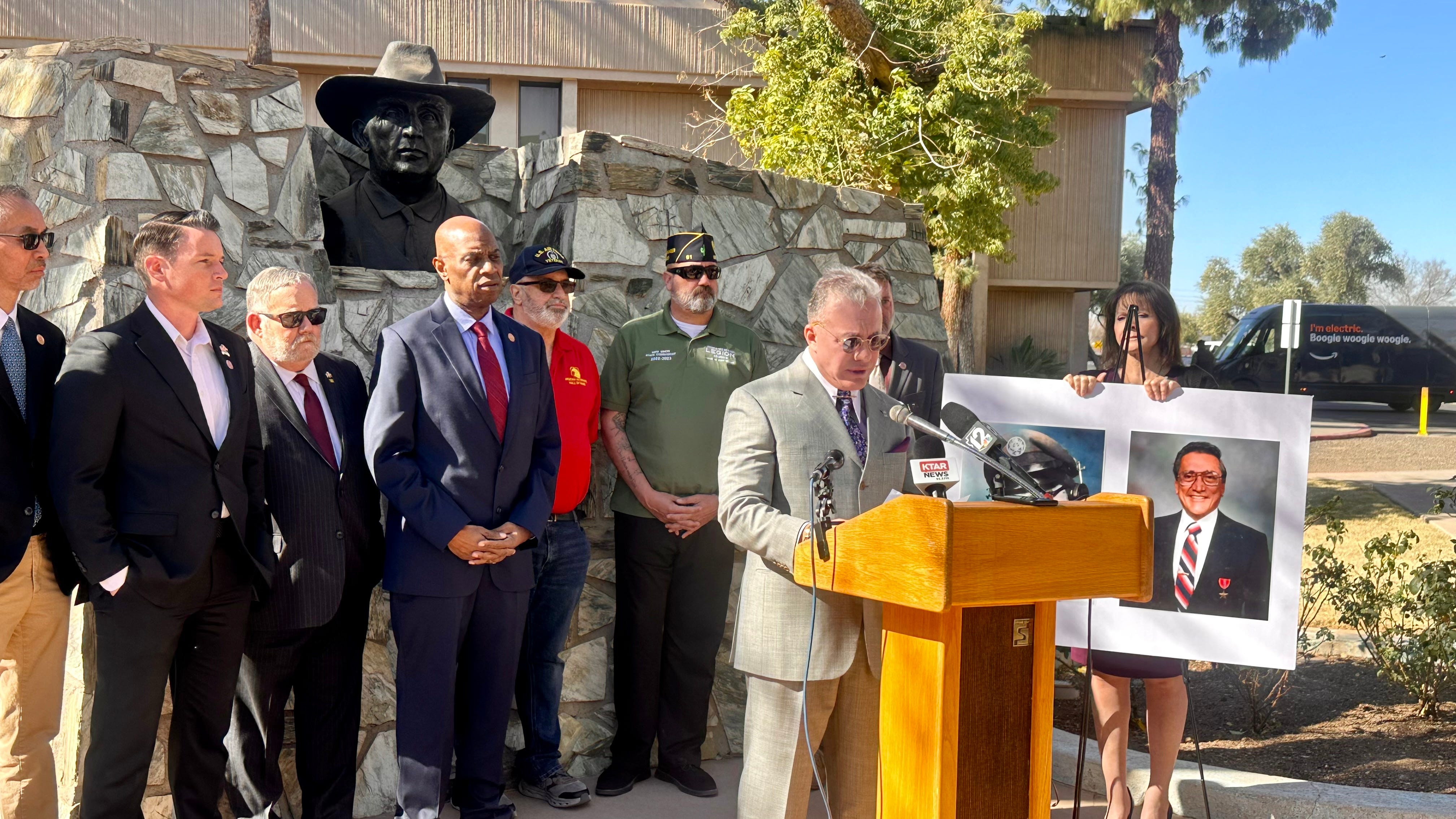Photo Credit: January 15, 2025 — Press conference at the Arizona State Capitol featuring Rep. Walt Blackman, various legislators, community members, and retired Master Sergeant Jack Dona speaking. Photo by Christy Kelly.