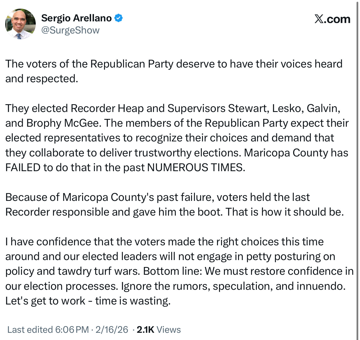 The conflict has now drawn in Arizona Republican Party Chairman Sergio Arellano, who publicly reminded party members that Republican voters elected both Recorder Heap and the current Board of Supervisors and expect those officials to work together.