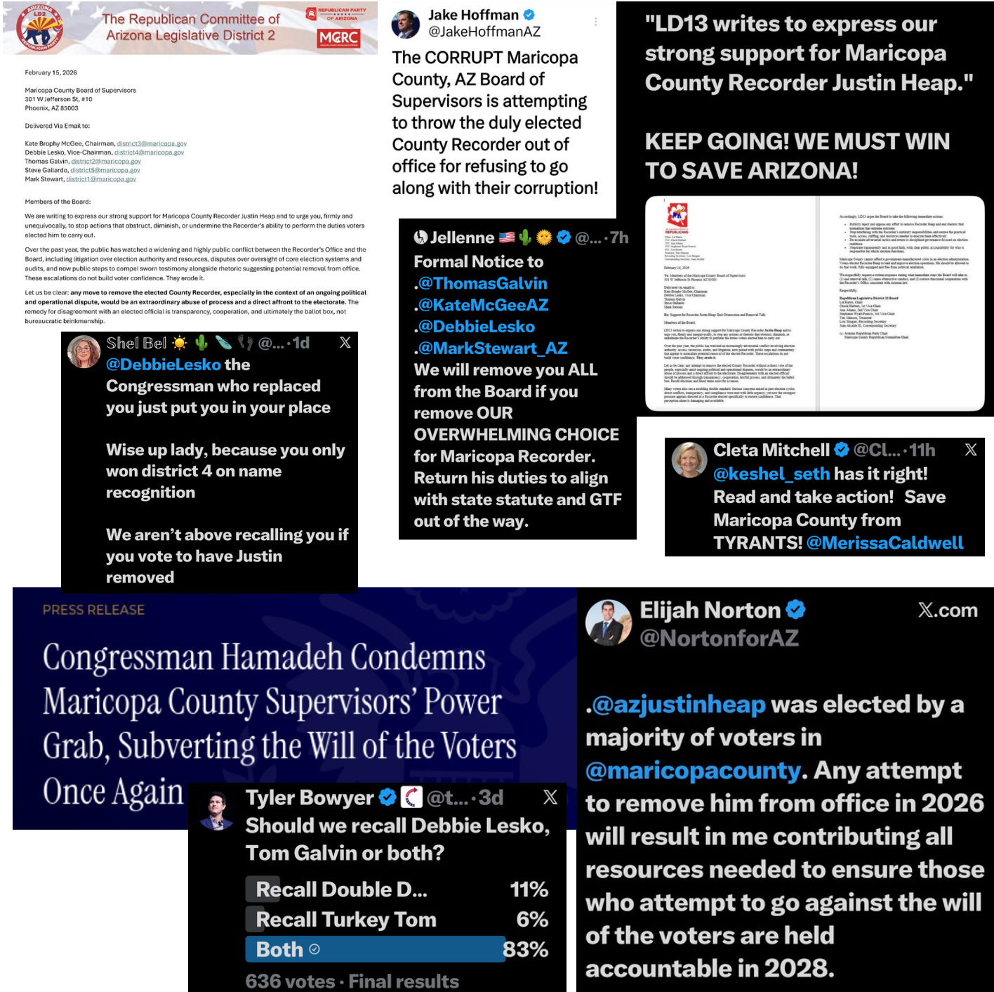 The latest flare-up between Maricopa County Recorder Justin Heap and the Maricopa County Board of Supervisors is no longer just a public spat over election operations. It has turned into a direct confrontation over compelled sworn testimony, the hiring of outside legal counsel by a sitting supervisor, political retreat by another, and the Arizona Republican Party entering the fight (sort of) — all while the Board openly floats removal from office if Heap refuses to comply.